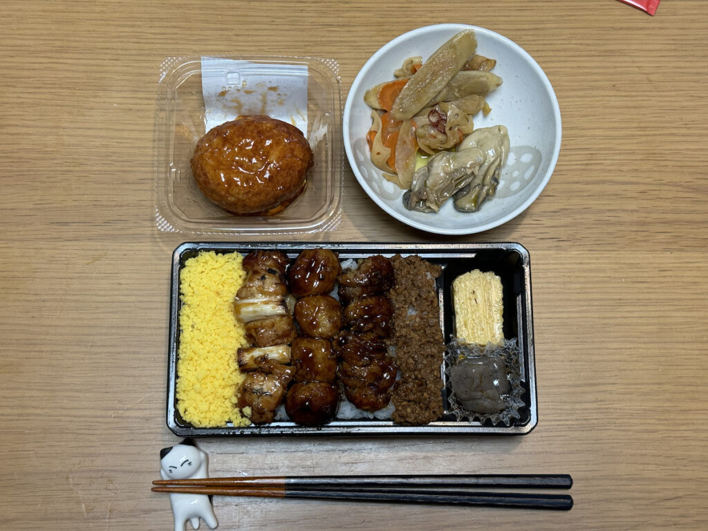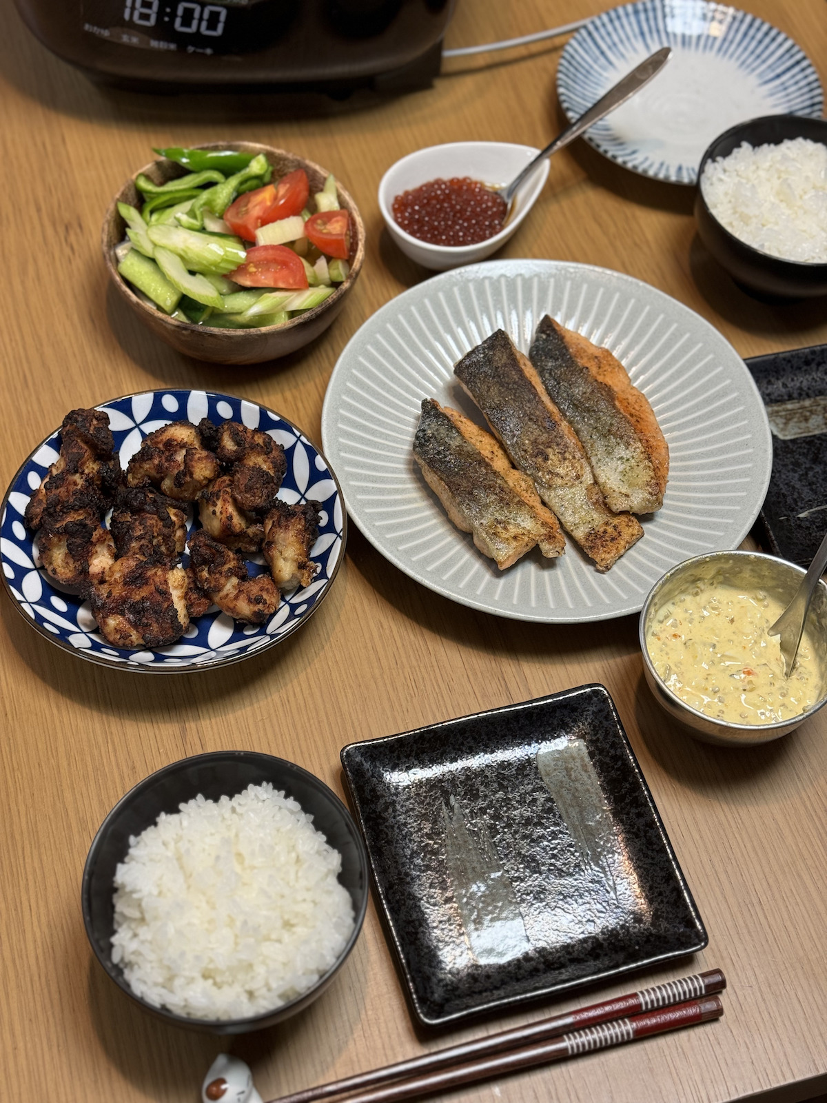 20:00 鮭のムニエル、ノンフライ唐揚げ、ピクルス、ごはん、いくら