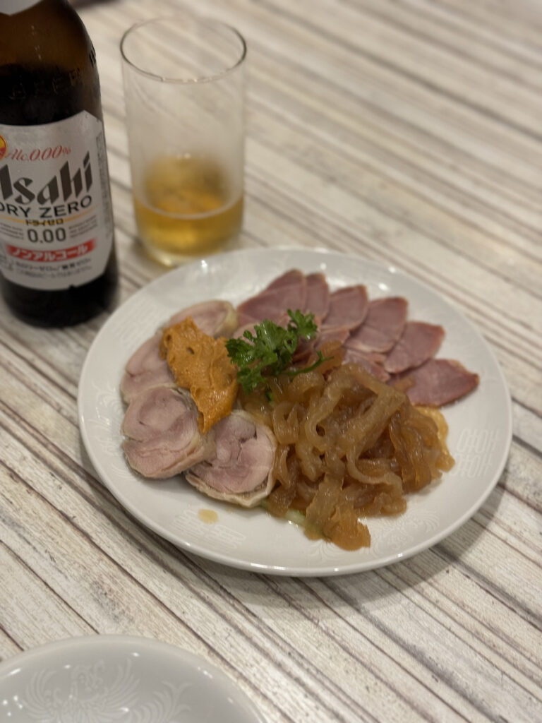 19:30 冷菜もりあわせ、餃子、酢豚、麻婆茄子、五目炒飯、ニラまんじゅう(ノンアルコールビール)