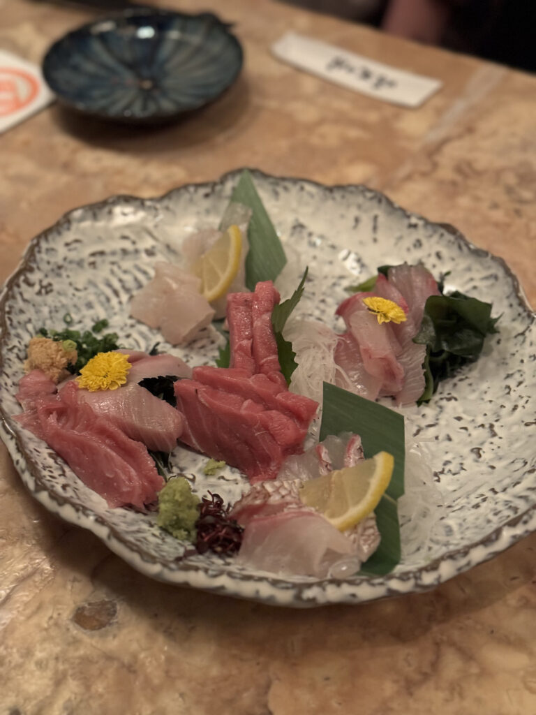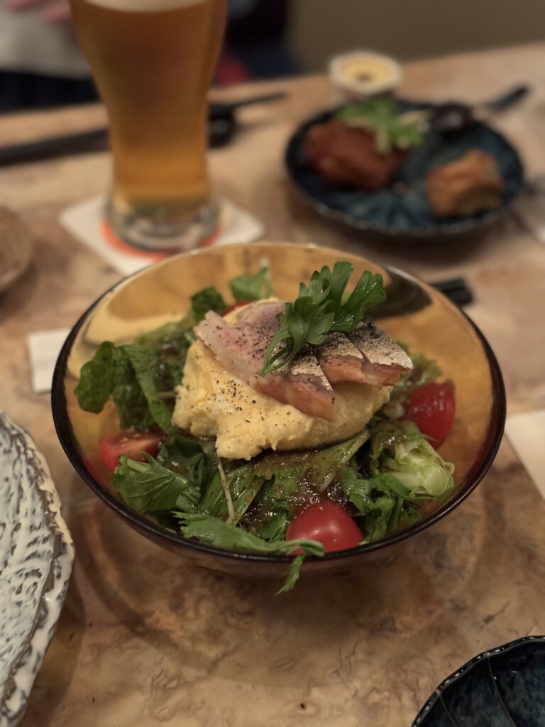 18:00 ホタテフライ、刺身もりあわせ、あぶり鯖ポテトサラダ、牛たたき、鮭ハラス燻製