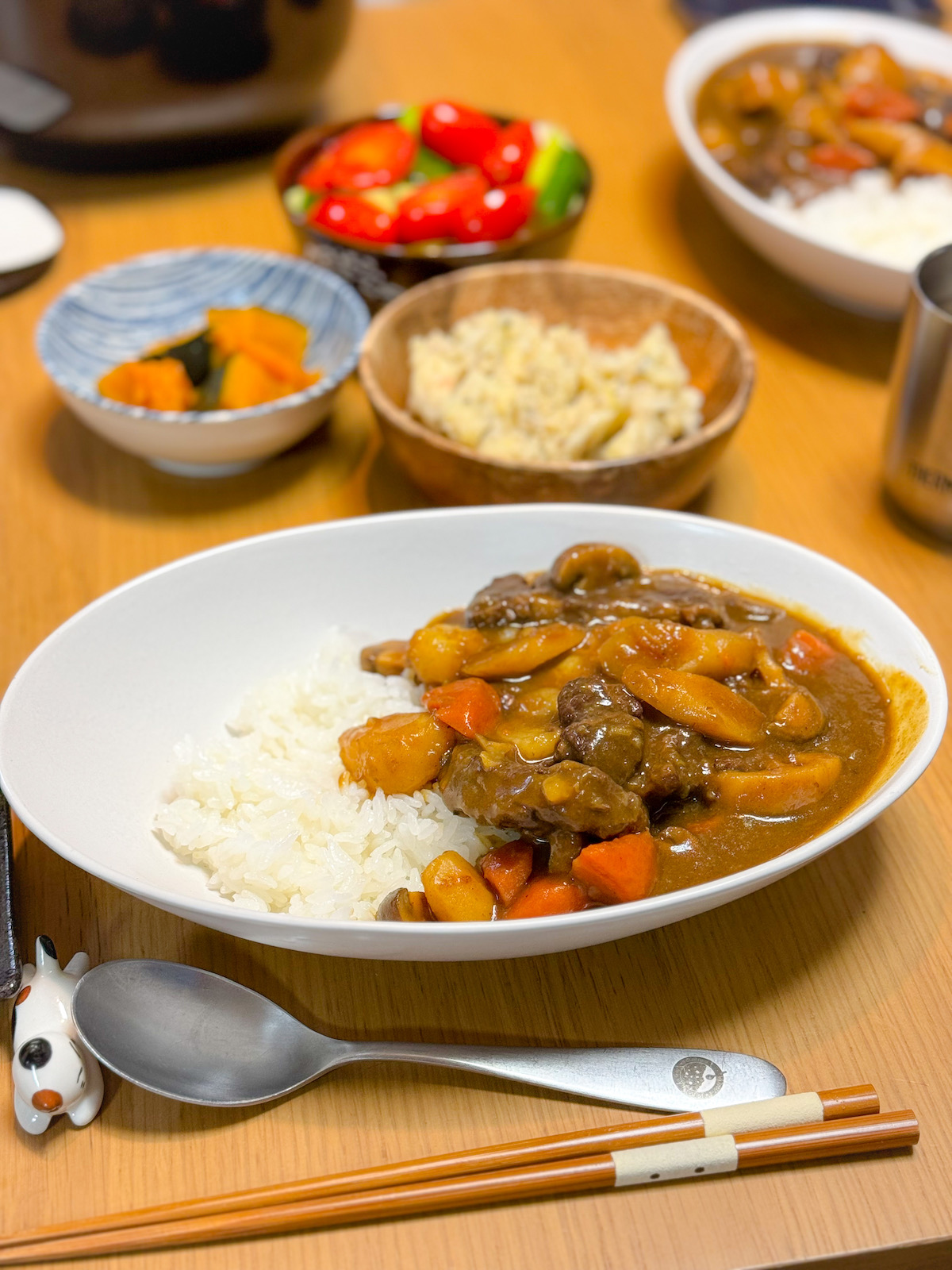 19:00 牛すね肉のカレー、ピクルス、炙りしめ鯖のポテトサラダ