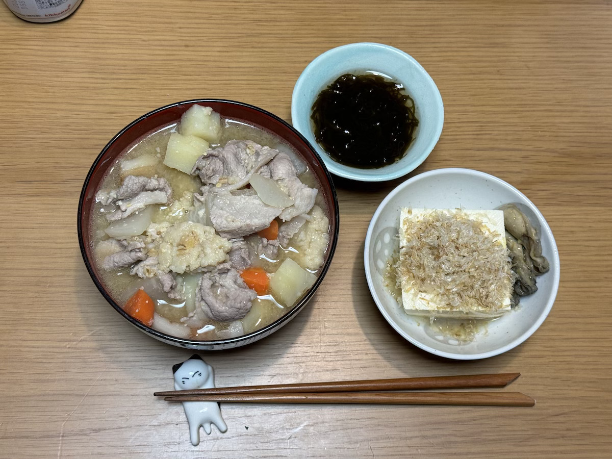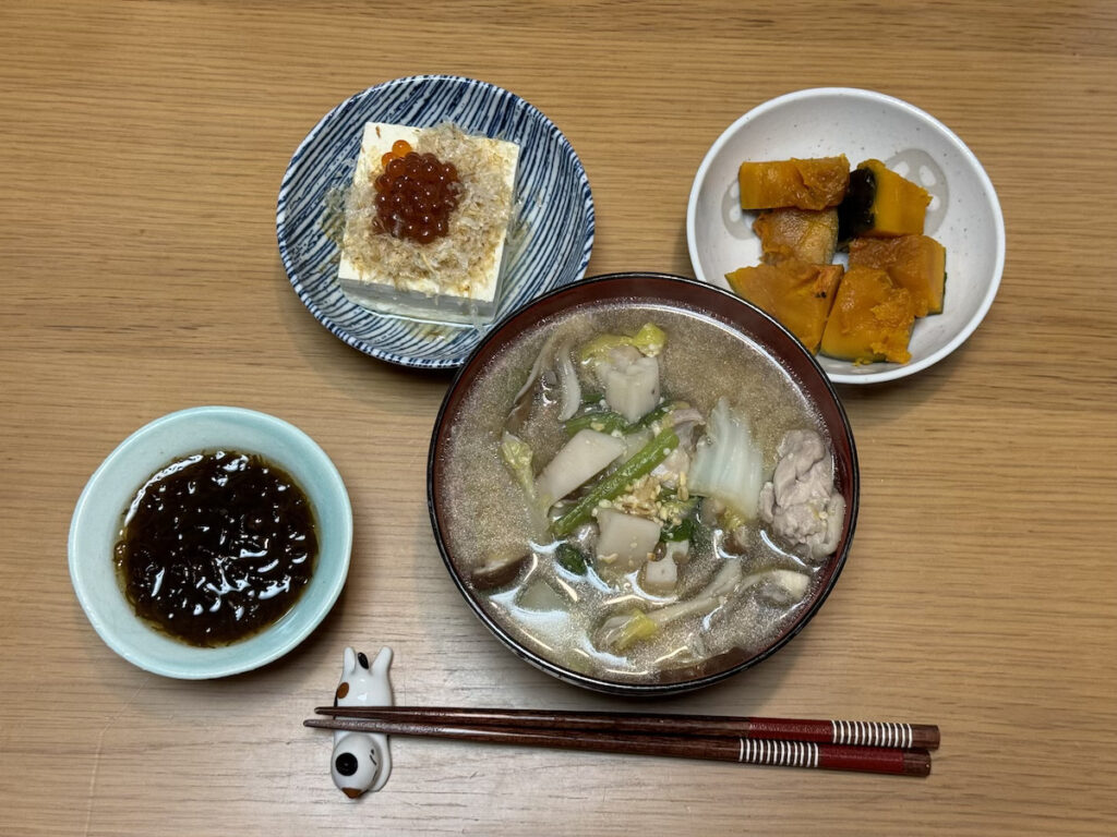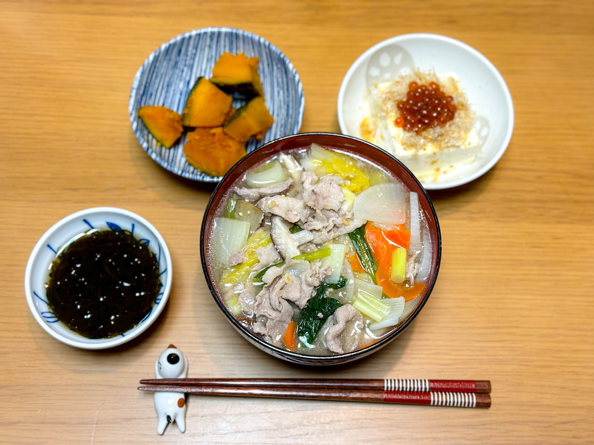23:30 白菜と根菜と鶏肉の味噌汁、カボチャ煮物、冷奴いくら添え