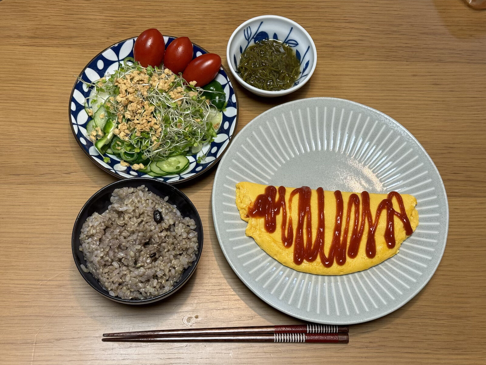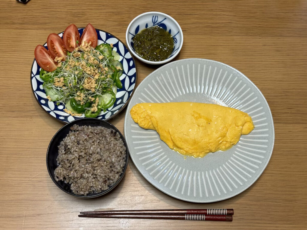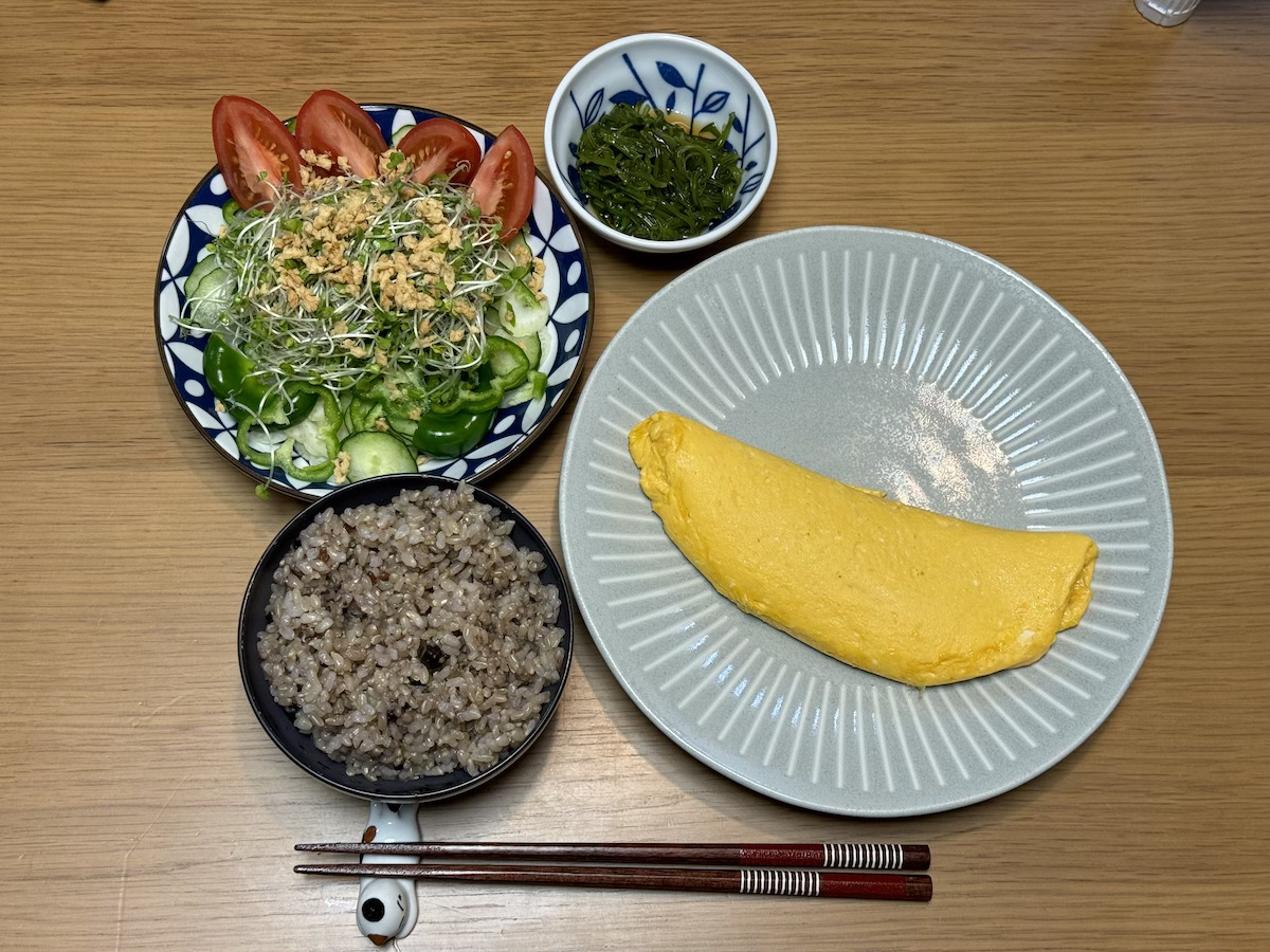 8:00 サラダ、オムレツ、玄米ご飯、めかぶ