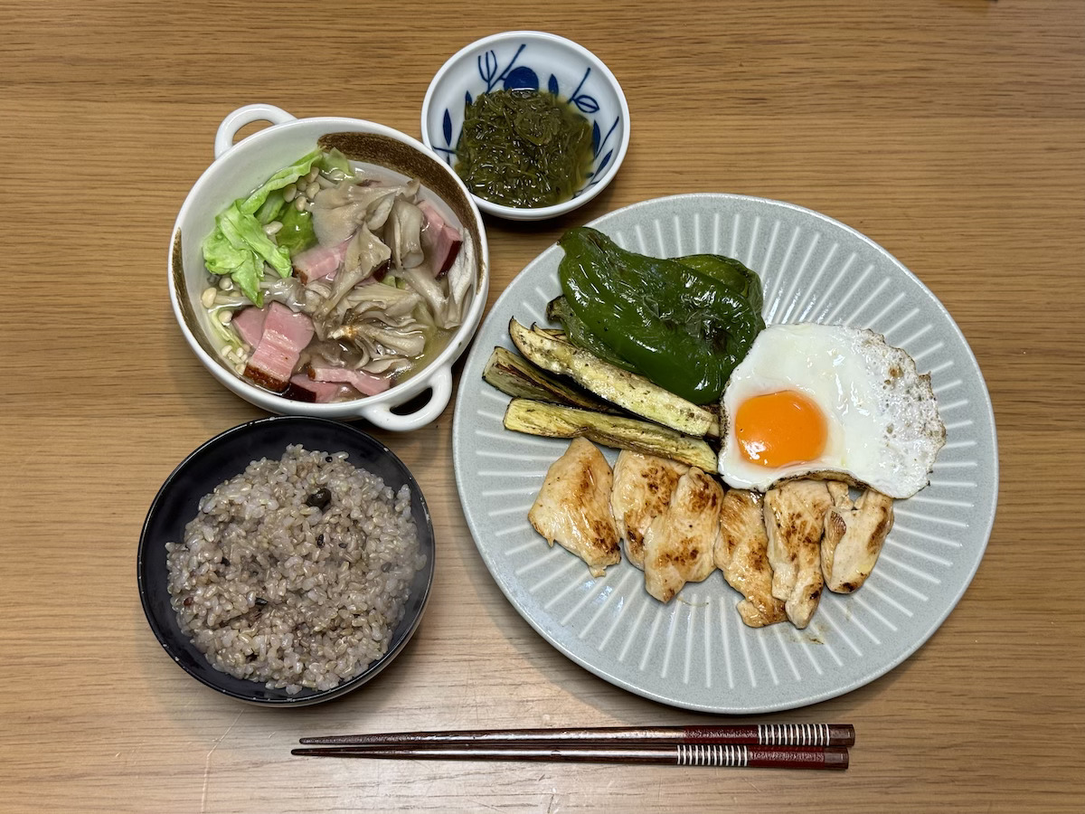 14:00 鶏もも照り焼き、マッシュルームサラダ、食物繊維汁、玄米ご飯