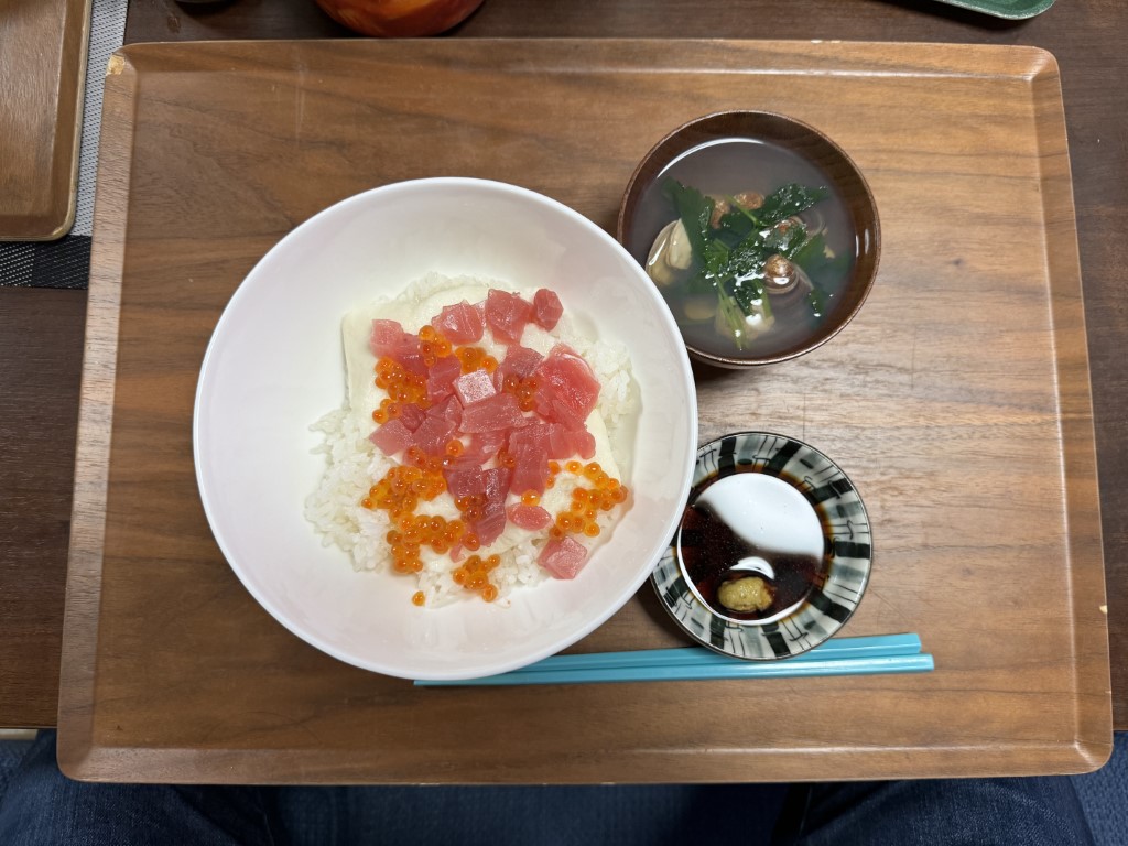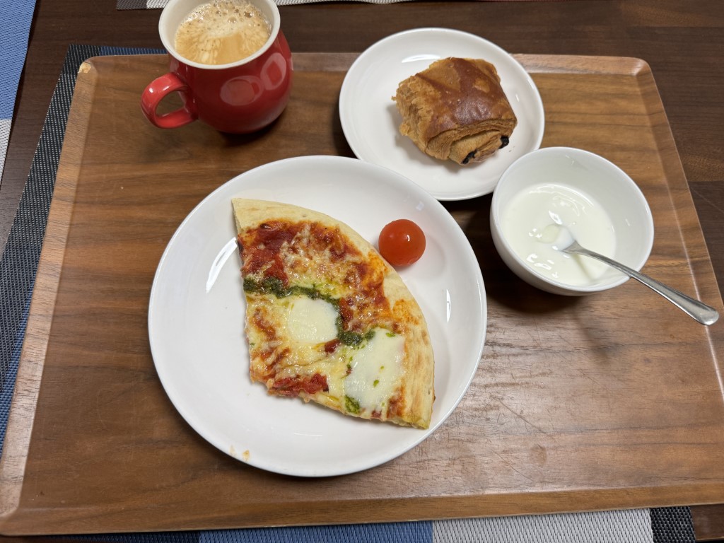 7:20 ピザ、チョコクロワッサン、ヨーグルト12:00 ハンバーグ、豚汁、ごはん14:00 ドーナツ3つ、コーヒー18:00 マグロととろろの海鮮丼、はまぐりの吸い物19:00 オムライス、唐揚げ