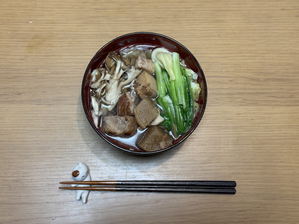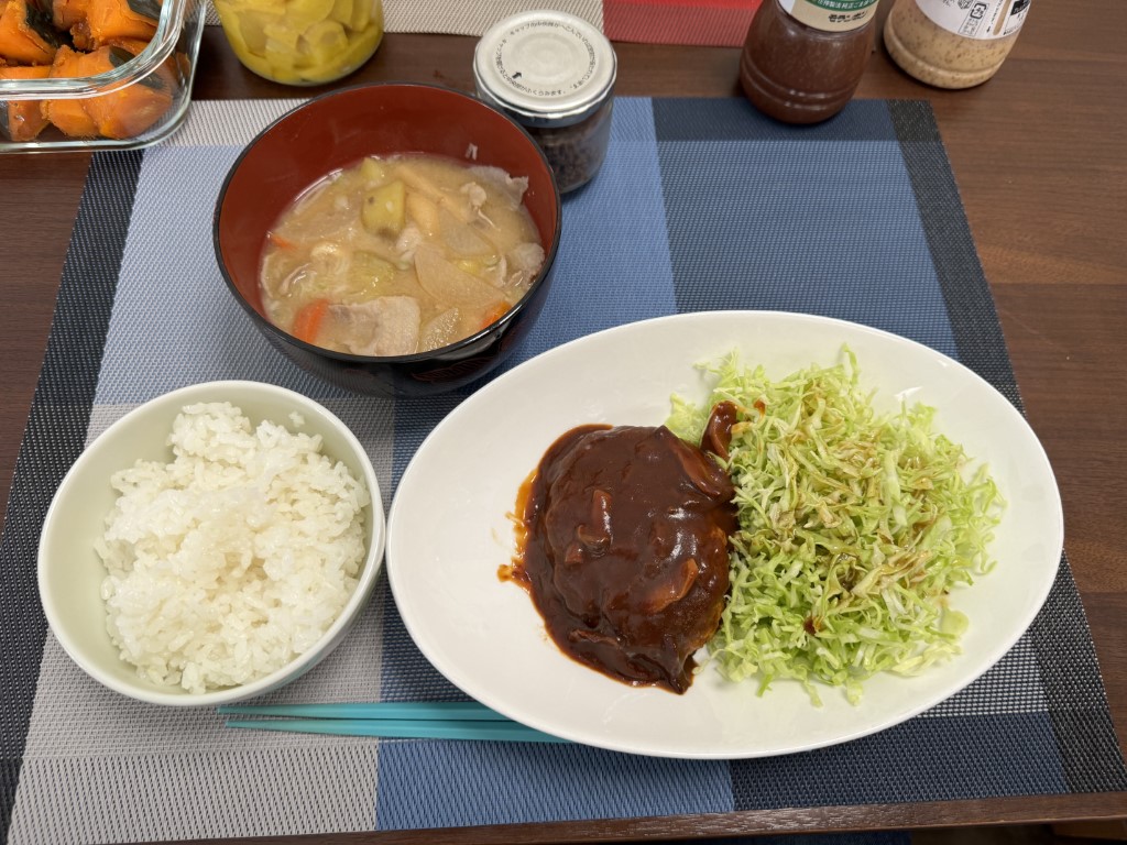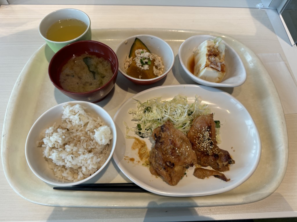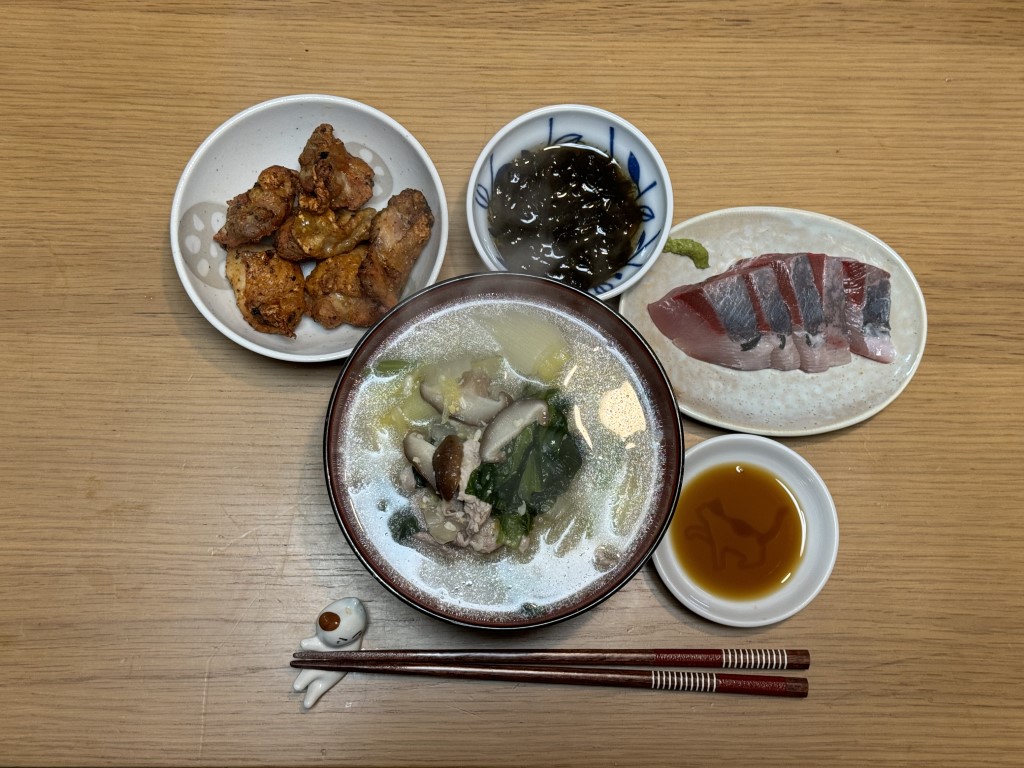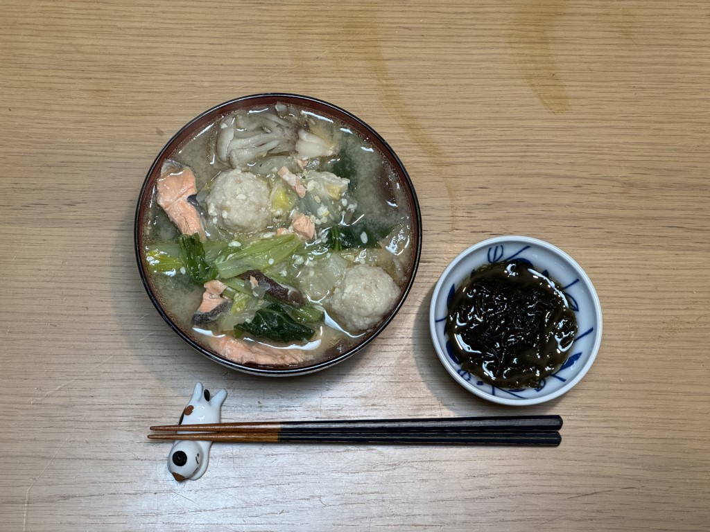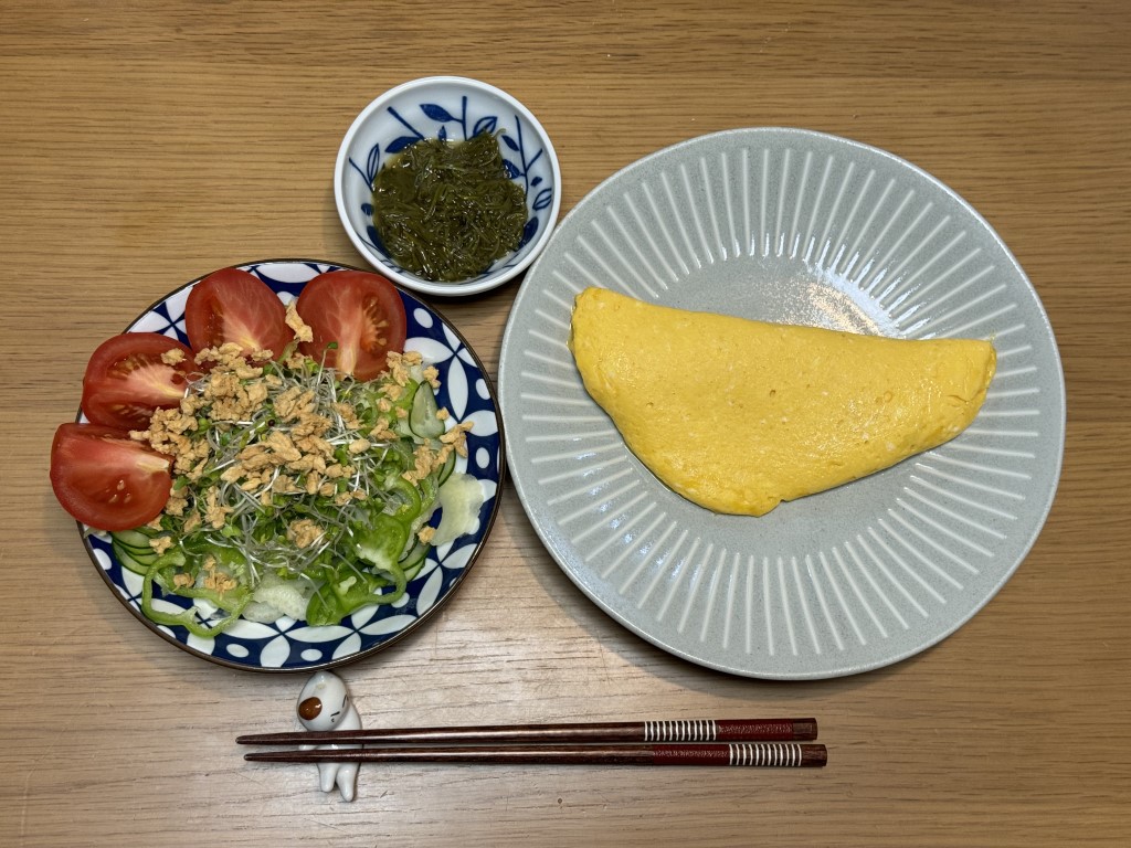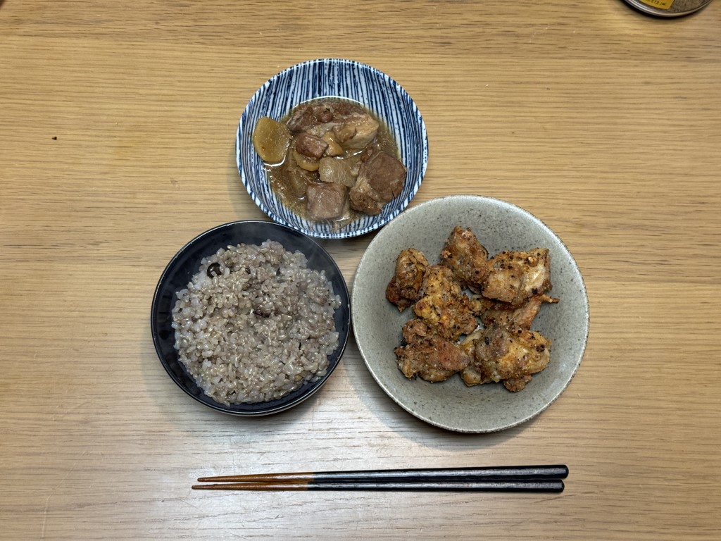 7:45 オムレツ、サラダ、めかぶ12:15 鶏もも照り焼き定食17:45 玄米ごはん、豚角煮大根、鶏ももノンフライ唐揚げ23:00 鮭と鶏団子と葉物野菜の味噌汁、もずく