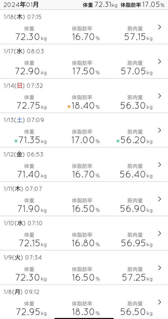 年末から続いた食事会ラッシュもようやく落ち着き、帰省も終わったので真面目に減量していきます。
