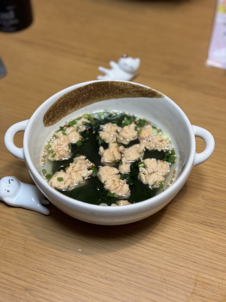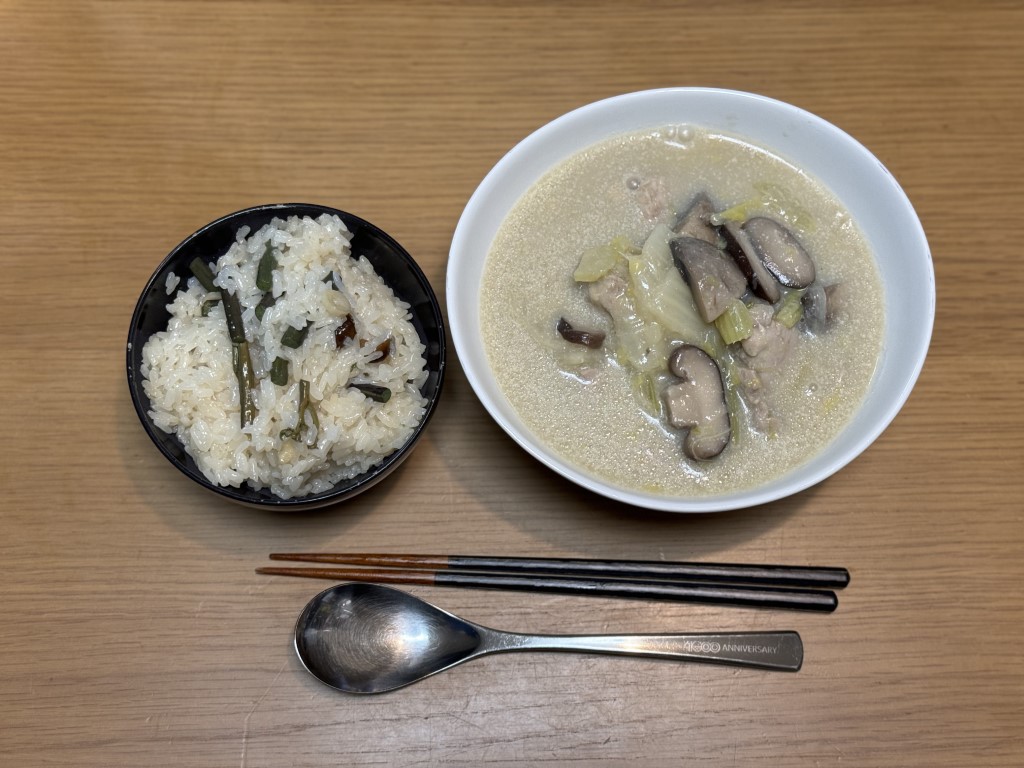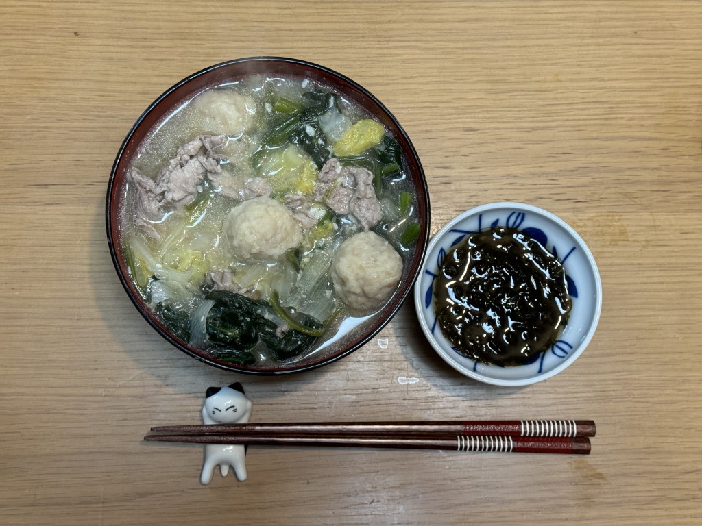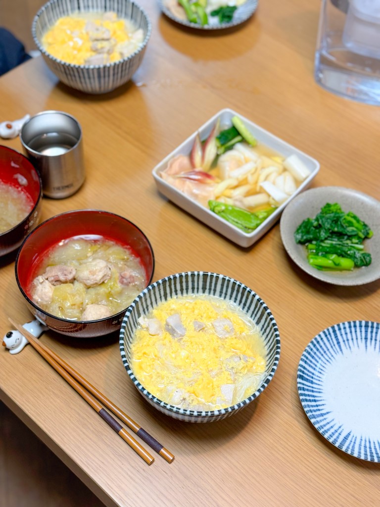 21:30 親子にゅうめん、チキンスープ、ピクルス、菜の花おひたし