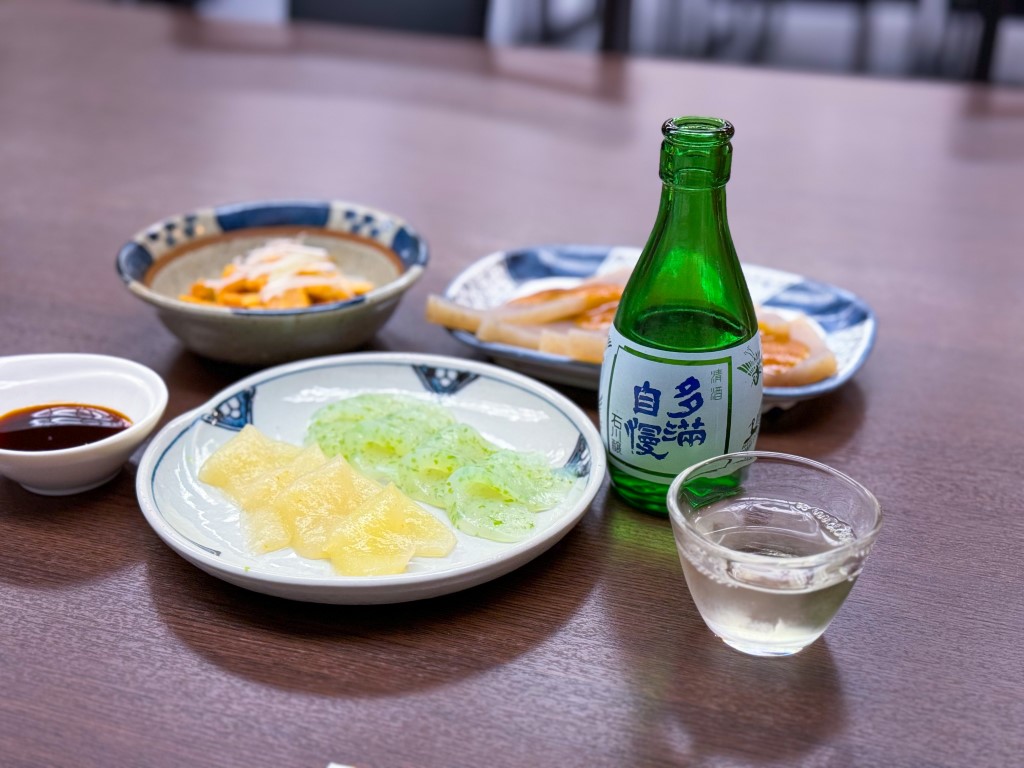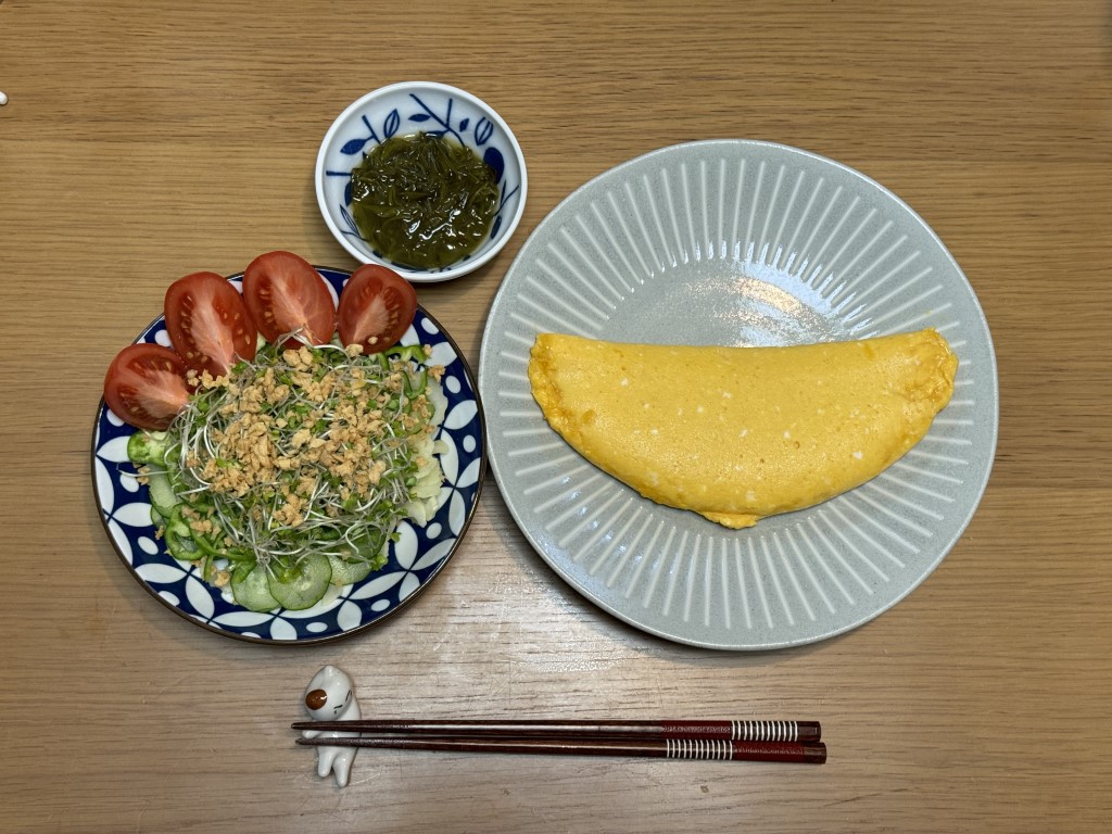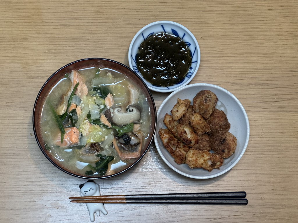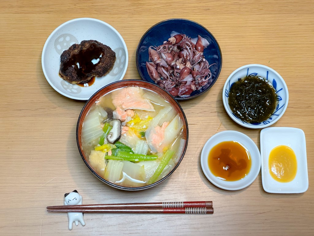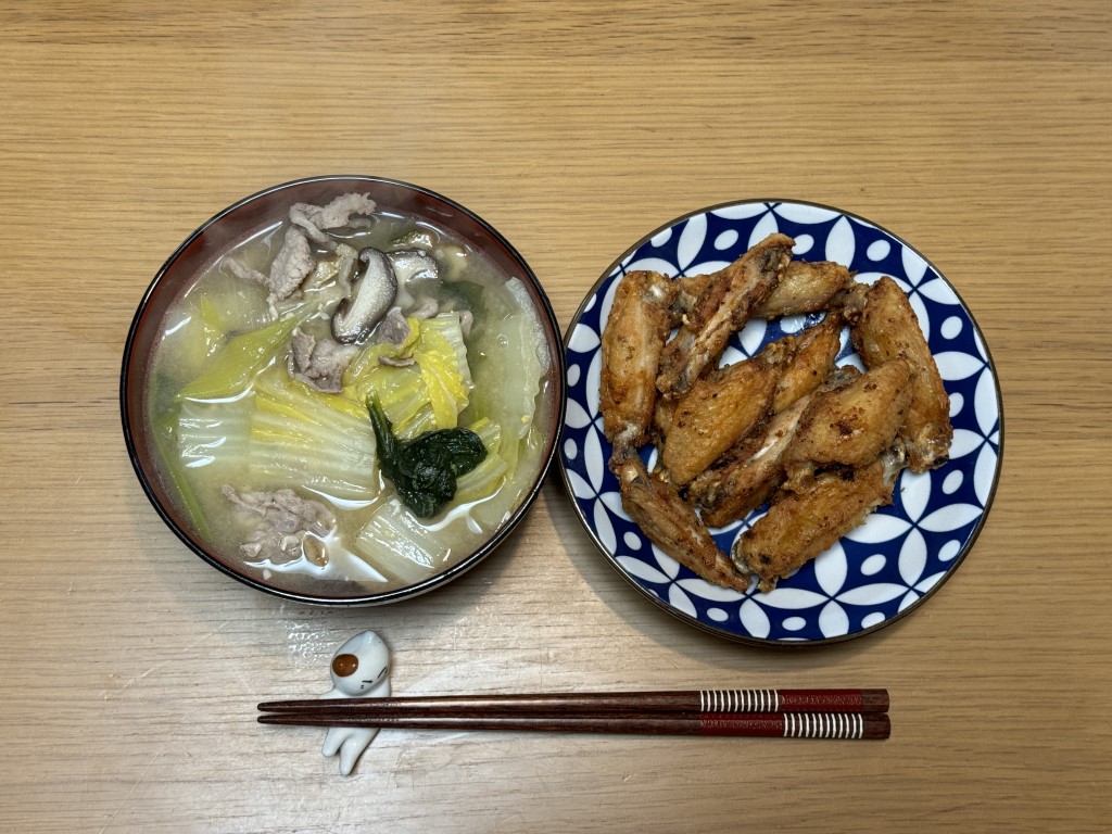 21:30 親子にゅうめん、チキンスープ、ピクルス、菜の花おひたし