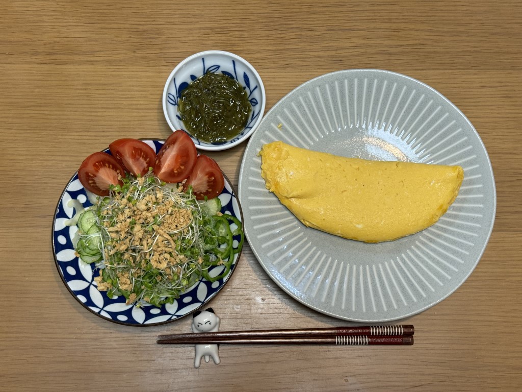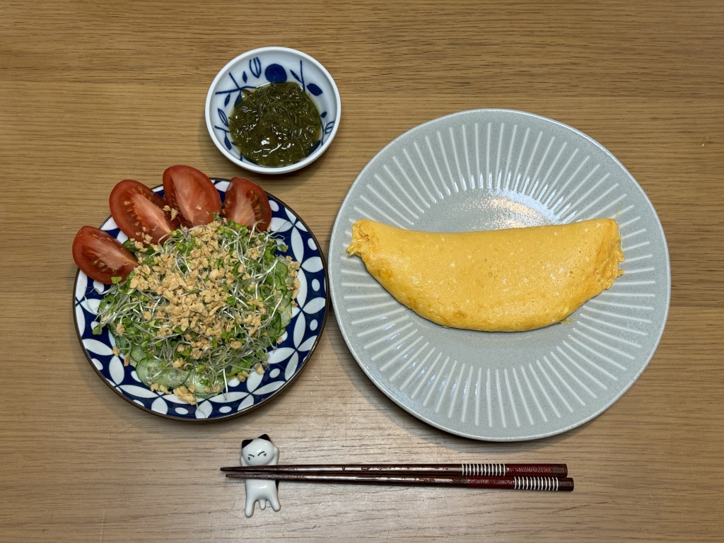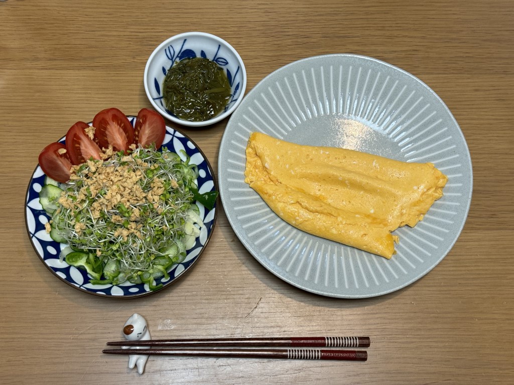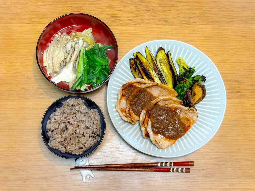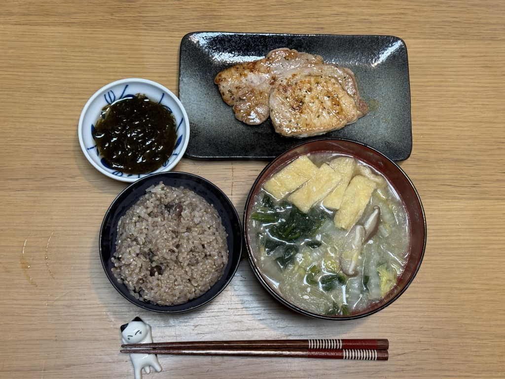 18:00 ポークソテー、葉物野菜の味噌汁、玄米ごはん、もずく