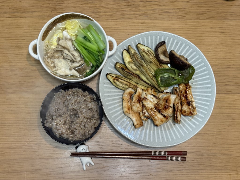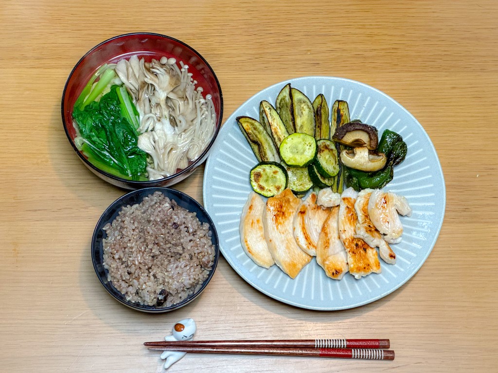 12:30 塩麹鶏むねソテー、グリル野菜、葉物野菜とキノコのスープ、玄米ごはん