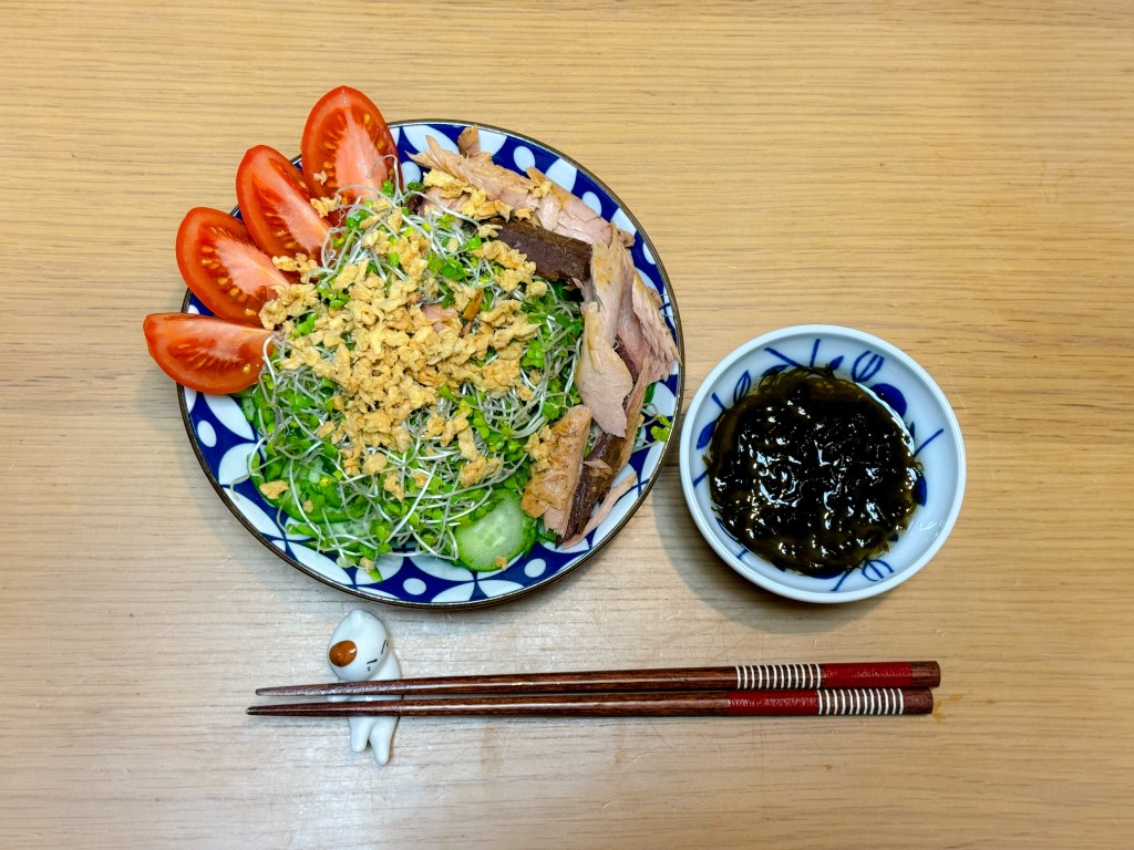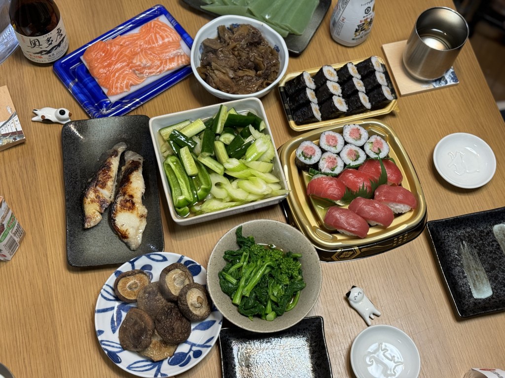 7:15 サラダ、オムレツ、めかぶ12:15 きのこ蕎麦、ミニ親子丼16:00 キャロットパウンドケーキ20:30 銀鱈西京焼き、サーモン刺身、牛すじしぐれ煮、野菜の浅漬け、しいたけグリル、菜の花おひたし、お寿司
