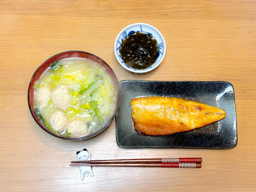7:45 オムレツ、サラダ、めかぶ13:30 スープカレー20:00 サバ塩焼き、葉物野菜と鶏団子の味噌汁、もずく