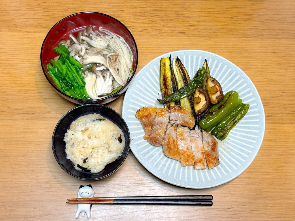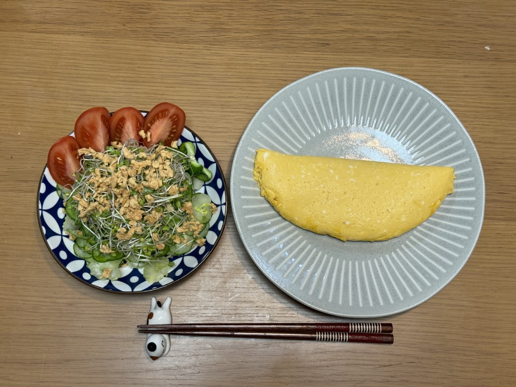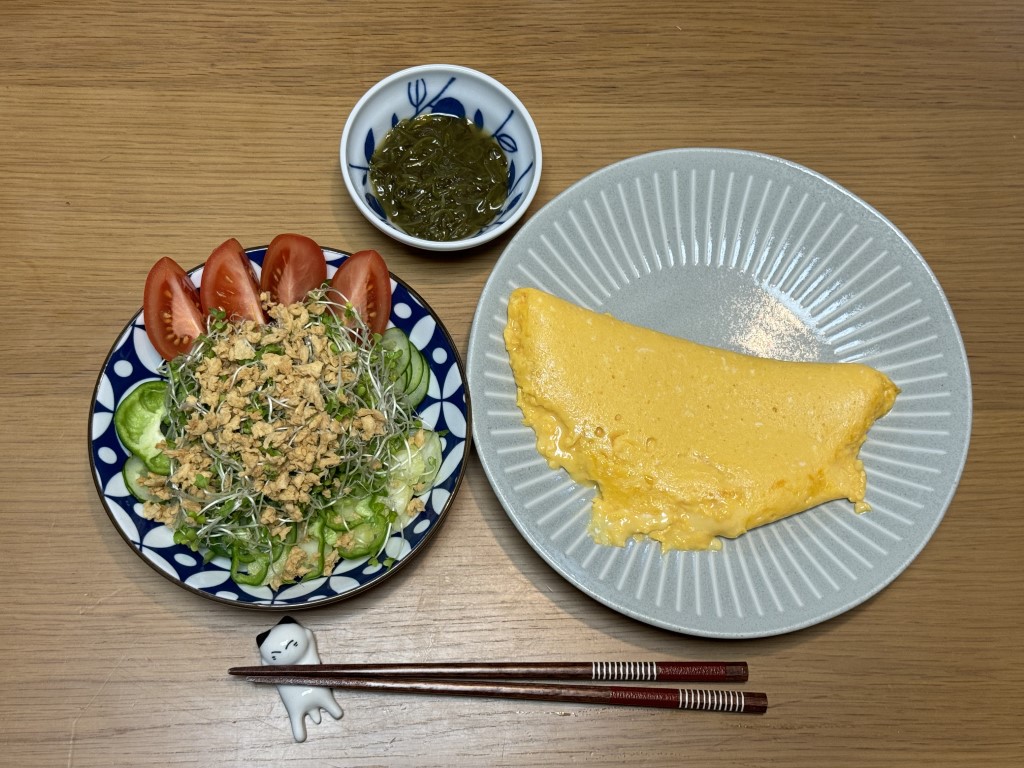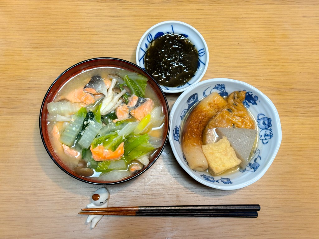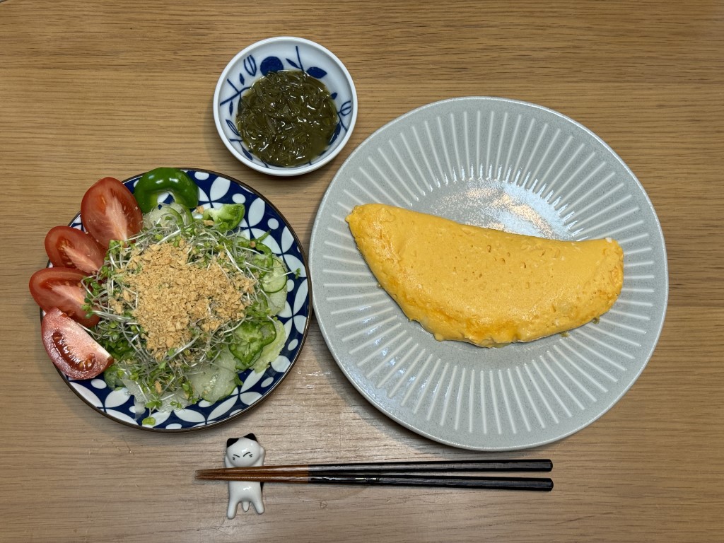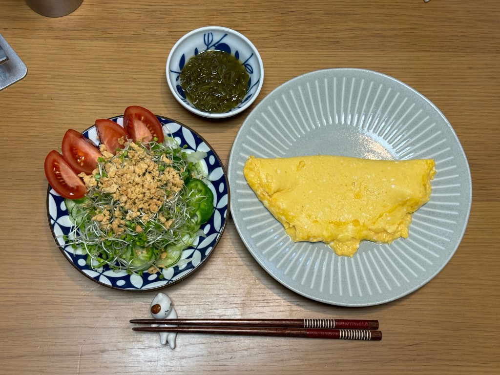 8:45 オムレツ、サラダ、めかぶ12:30 ポークソテー、野菜グリル、葉物野菜とキノコのスープ、山菜おこわ22:30 鮭と葉物野菜の味噌汁、おでん、もずく