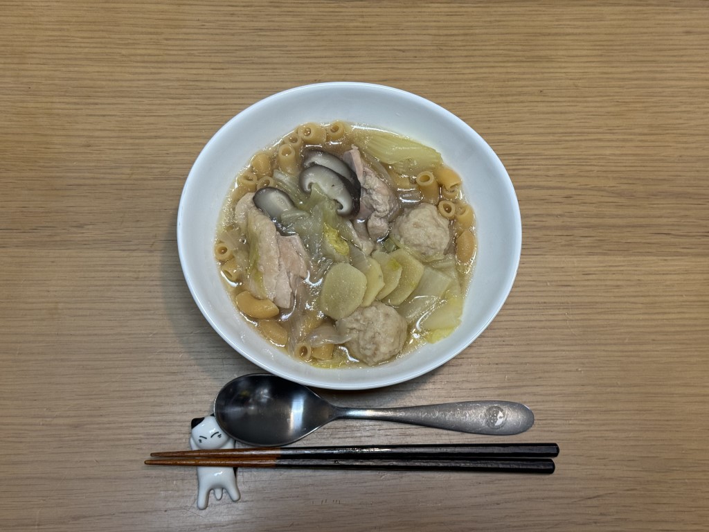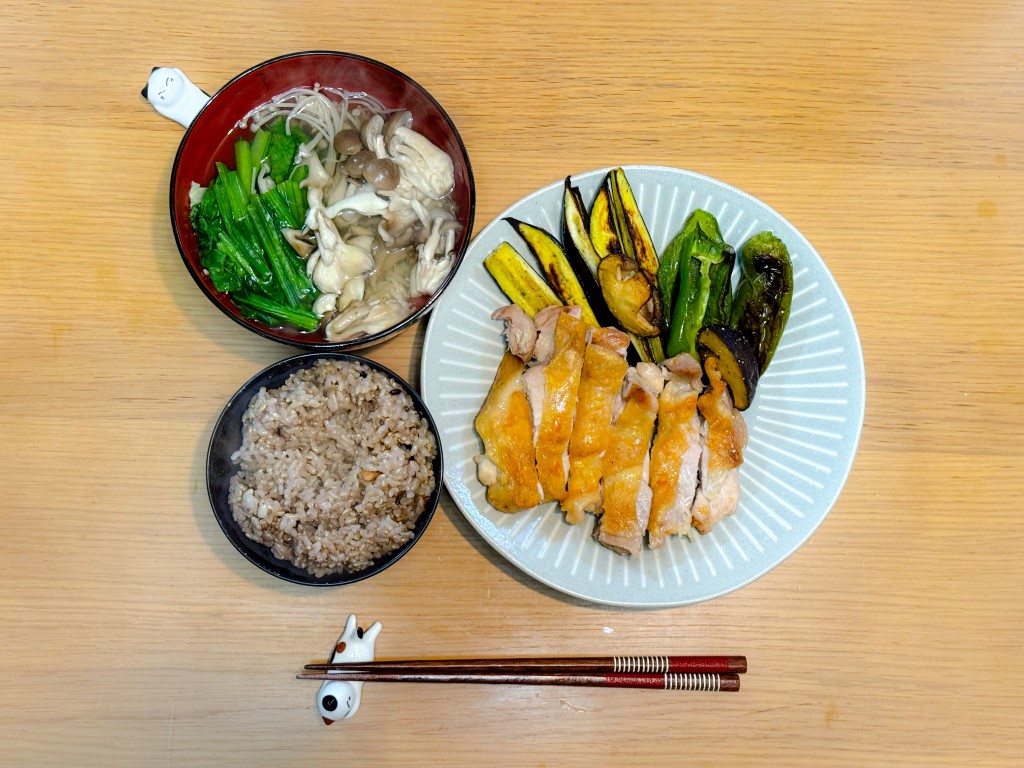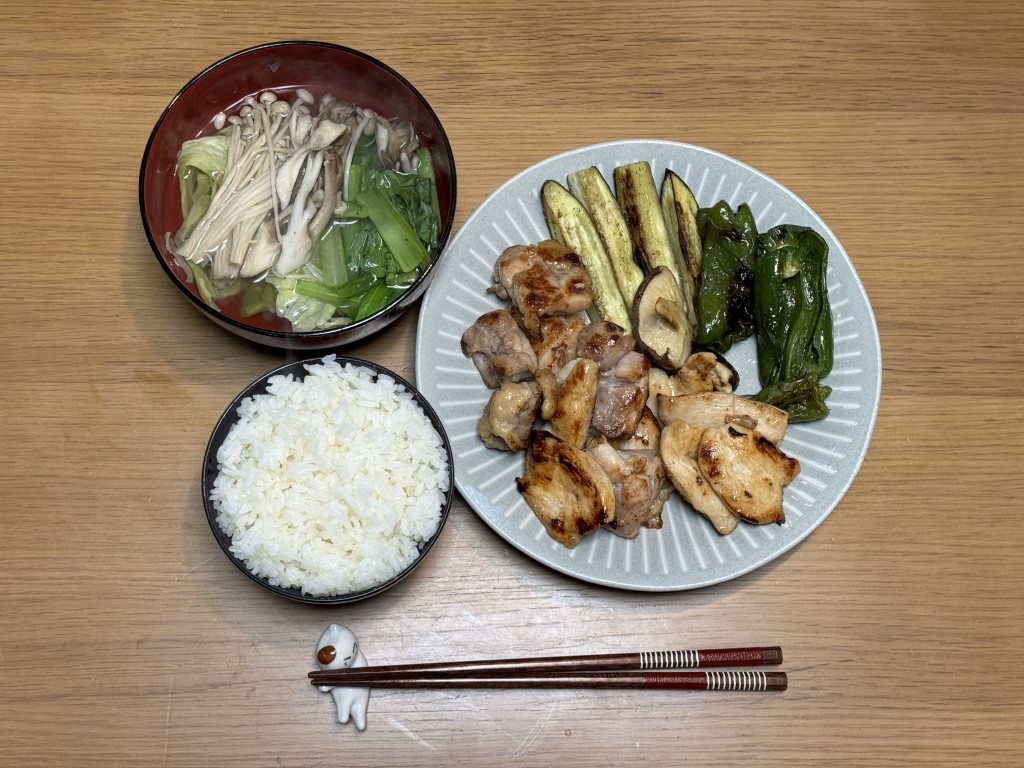 7:40 ハムたまごサンド12:30 鶏もも塩焼き、野菜グリル、葉物野菜ときのこのスープ、玄米ごはん18:00 チキンと白菜の生姜スープ(ZENBマメロニ)21:30 チキンと白菜の生姜スープ