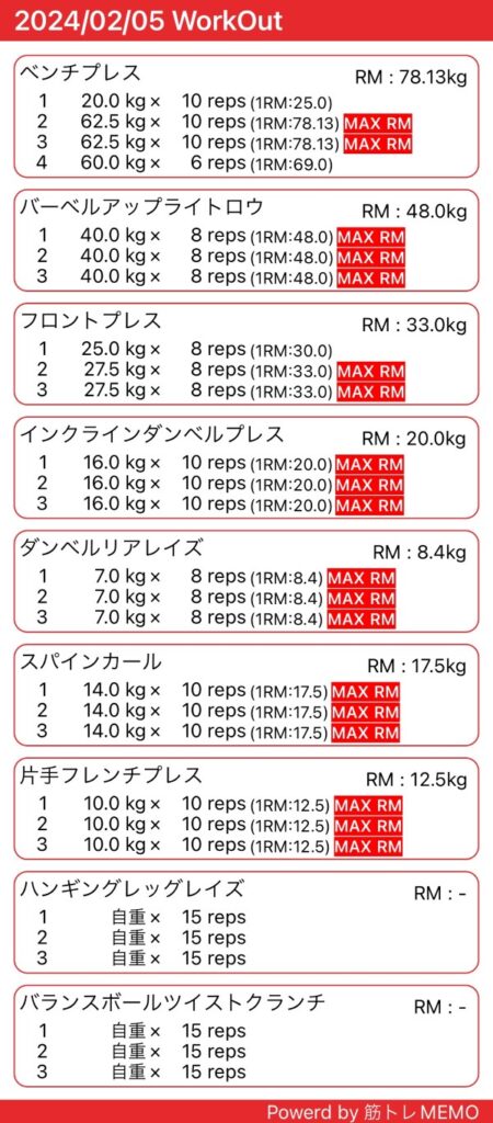 ジムで筋トレ。胸・肩・腕・腹筋のトレーニング。