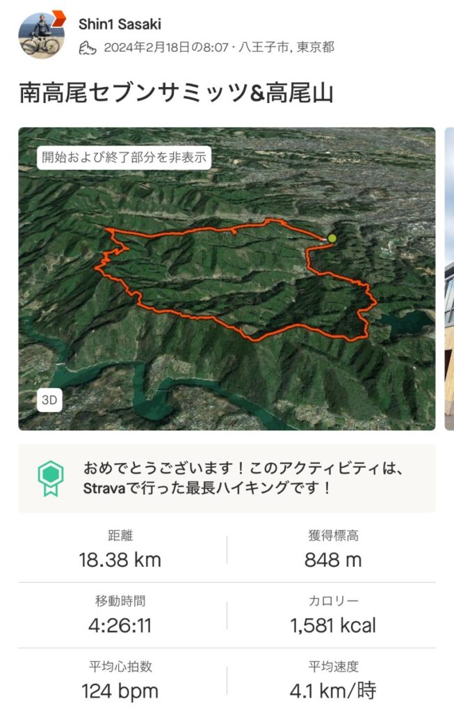 高尾山口駅からスタートして、7つの山を登ったあと、高尾山に登って降りて、高尾山口駅でゴール。山道をトータル18キロと、結構しっかり歩きました。駅前のスパ銭で入ったお風呂がめちゃくちゃ気持ちよかった…!