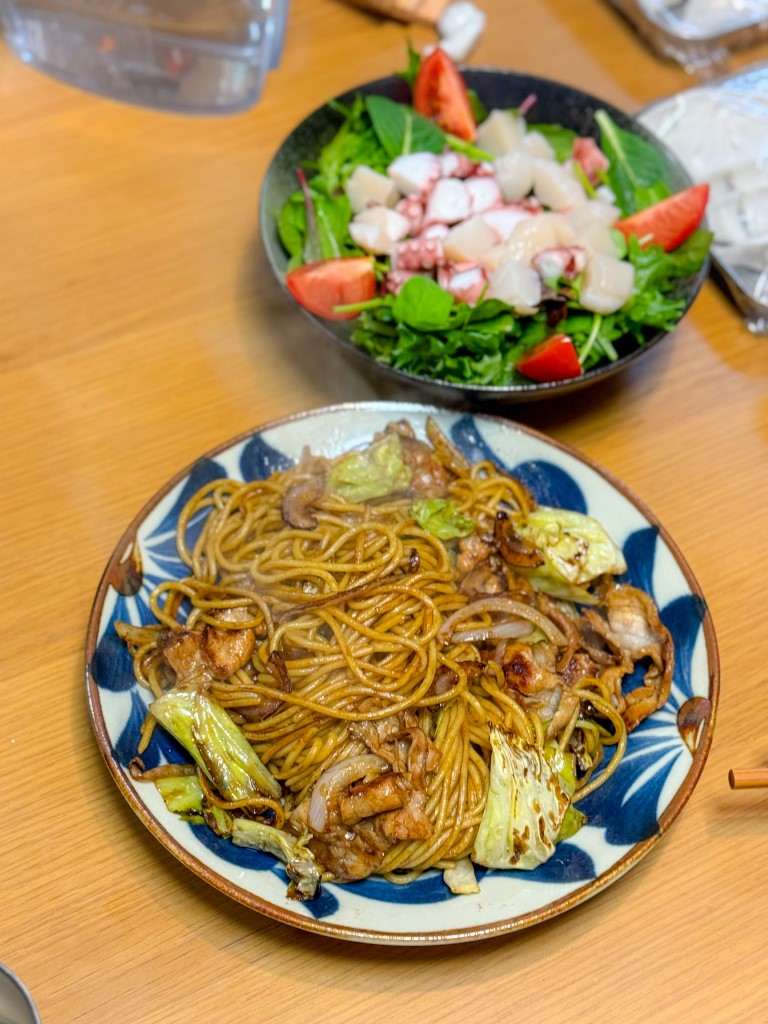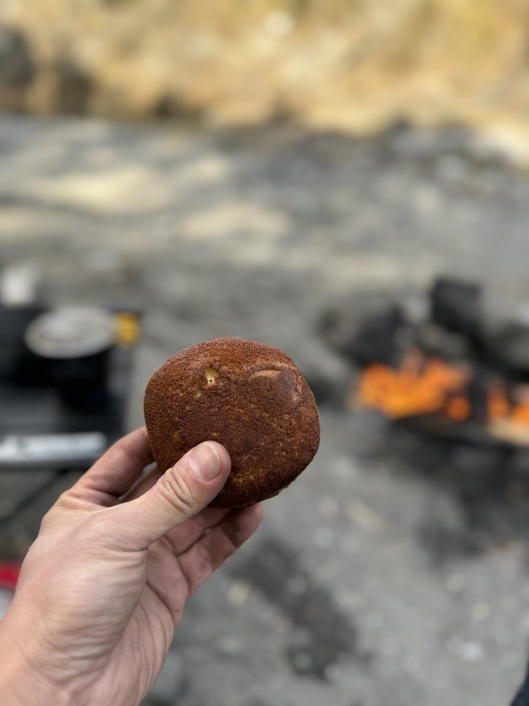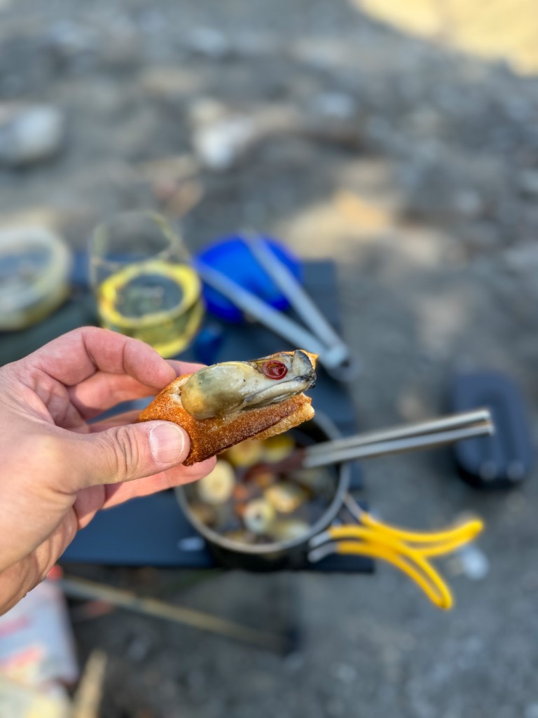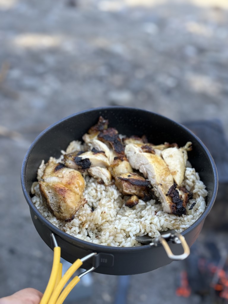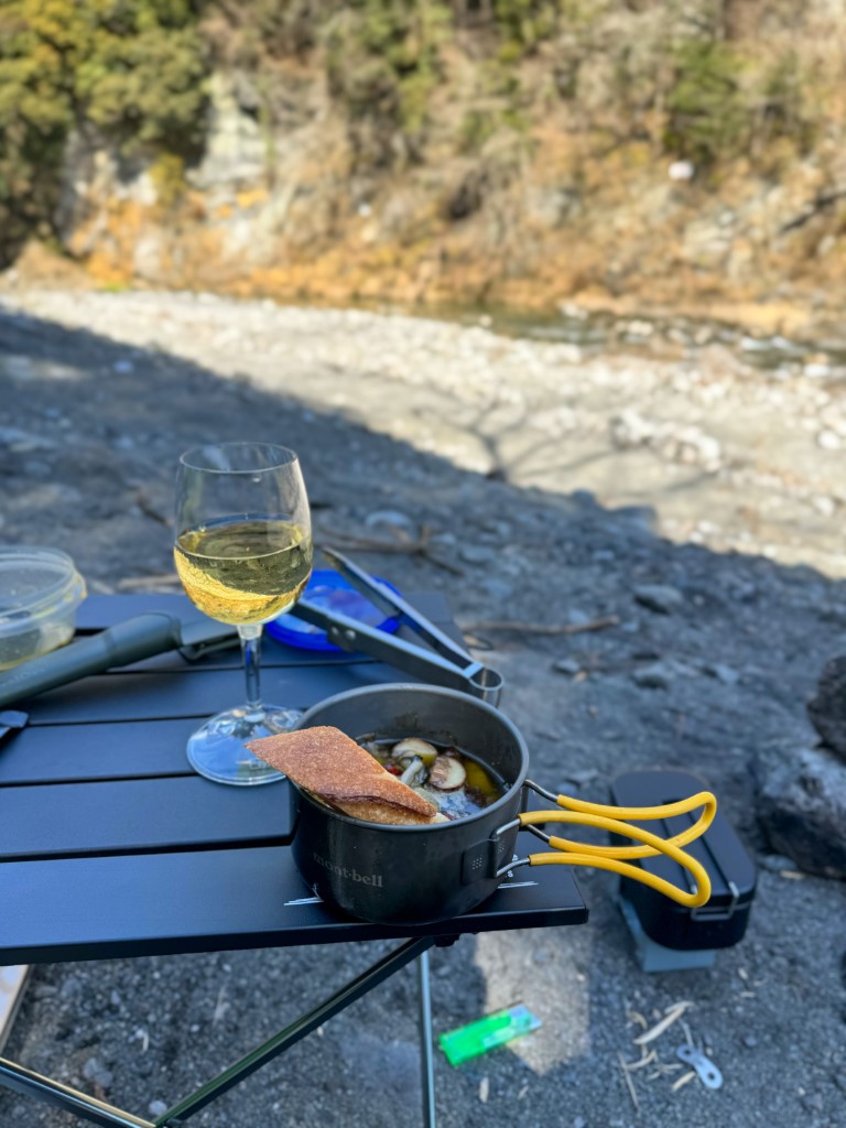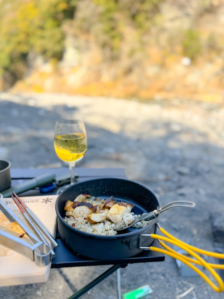 薪を買って焚き火しながら調理開始。アヒージョでワイン飲みつつ、ガーリックチキン焼いてガーリックライス作って食べてたら、ワイン1本空きました。