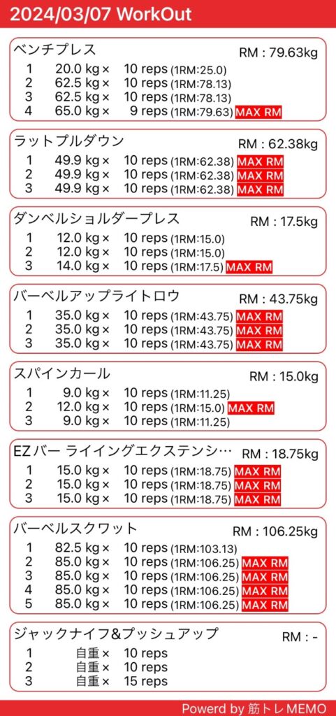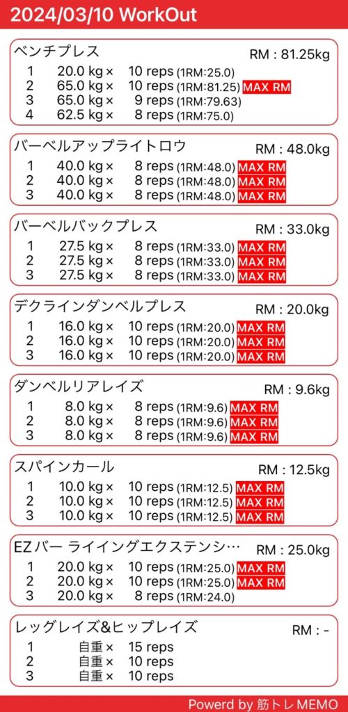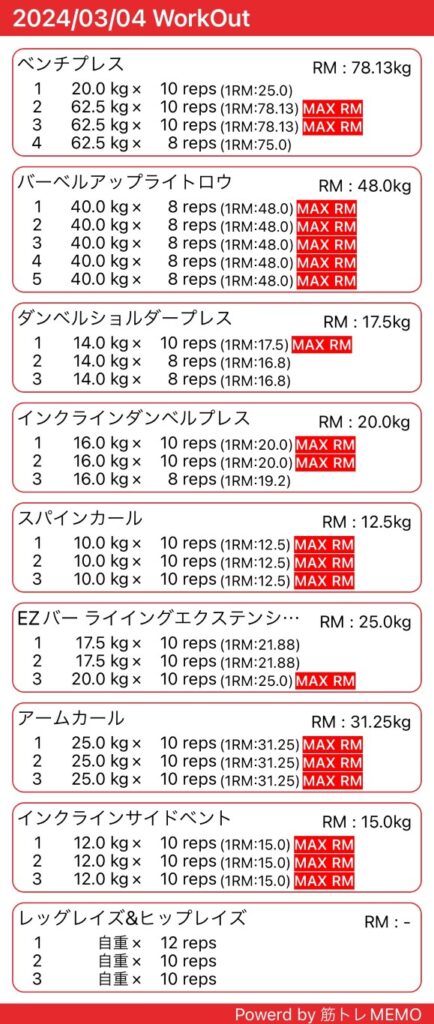 仕事後にジムで筋トレ&有酸素運動。上半身のトレーニングでした。