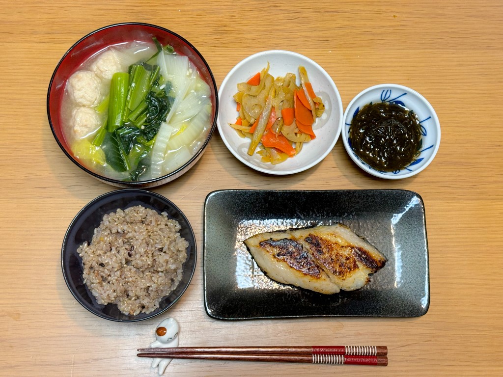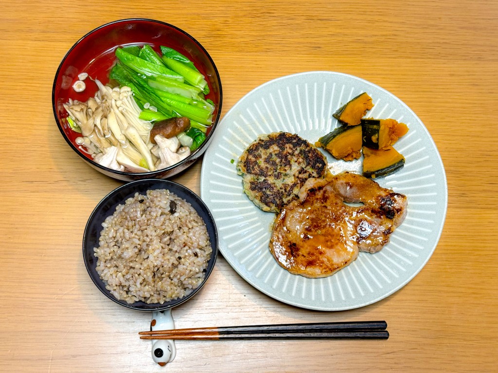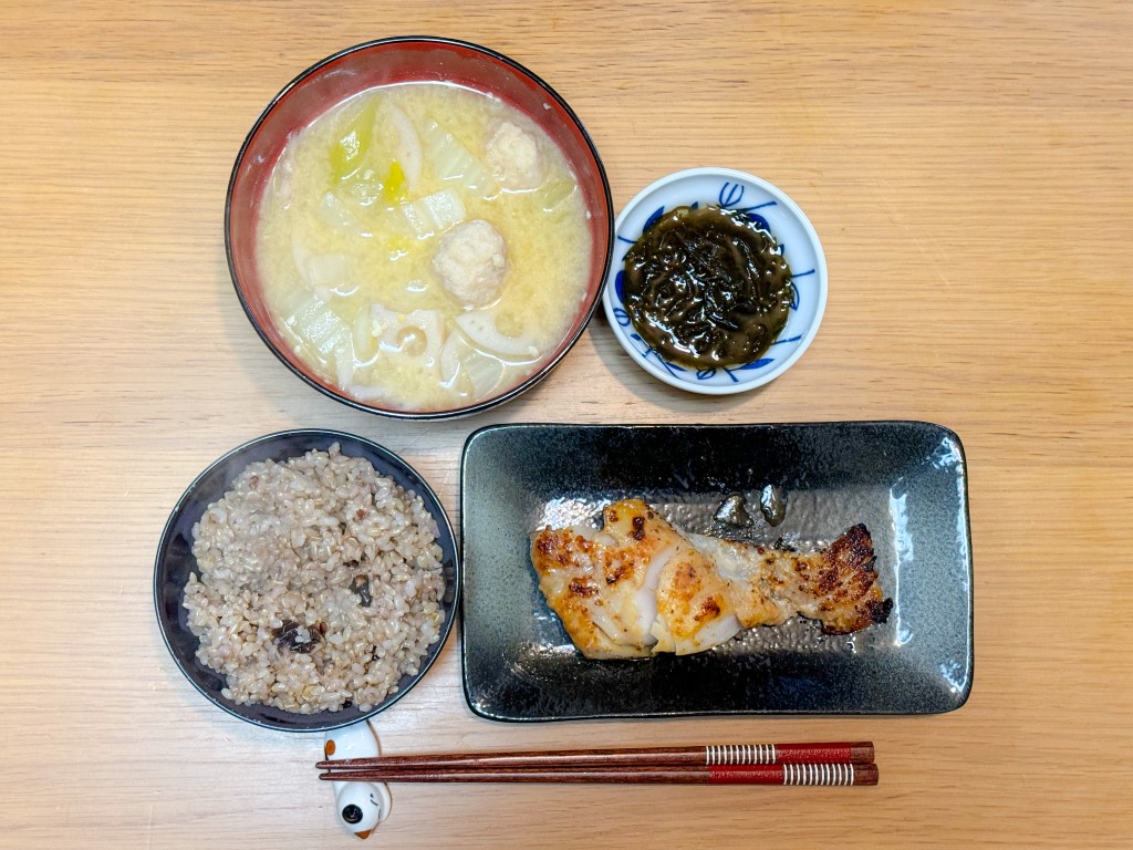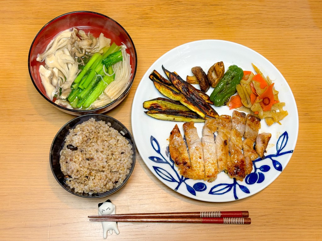 7:30 目玉焼き、玄米ごはん、めかぶ15:00 豚味噌漬け、野菜グリル、きんぴら、葉物野菜とキノコのスープ、玄米ごはん18:00 鱈粕漬け焼き、ハクサイとれんこんの味噌汁、もずく、玄米ごはん