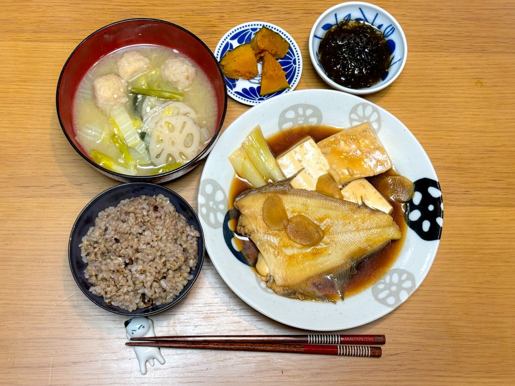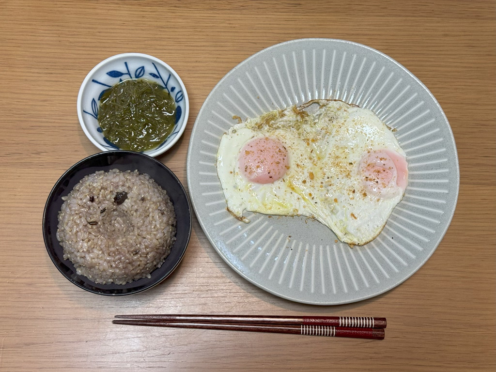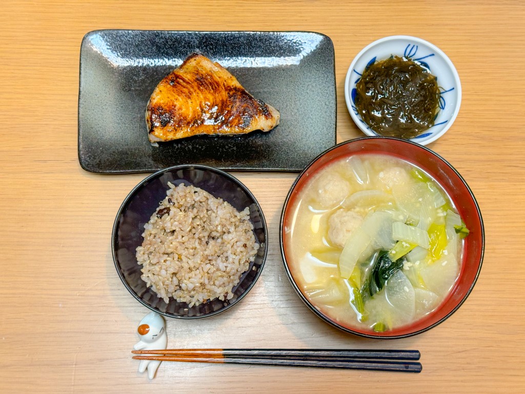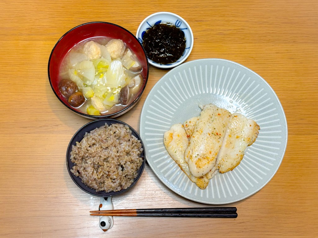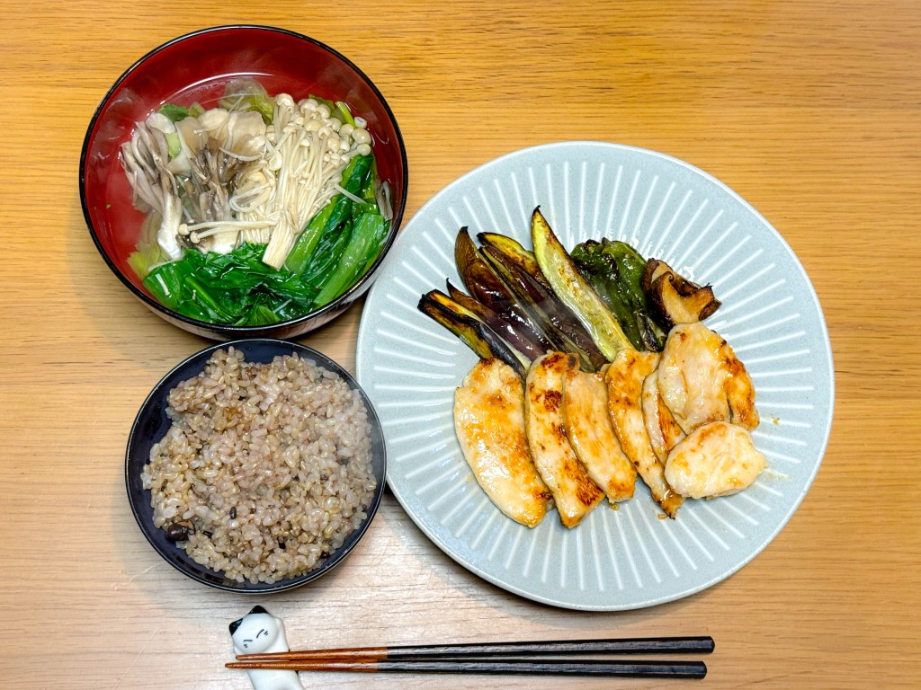 7:30 目玉焼き、玄米ごはん、めかぶ15:00 豚味噌漬け、野菜グリル、きんぴら、葉物野菜とキノコのスープ、玄米ごはん18:00 鱈粕漬け焼き、ハクサイとれんこんの味噌汁、もずく、玄米ごはん