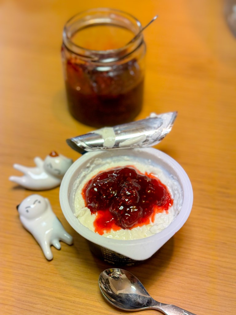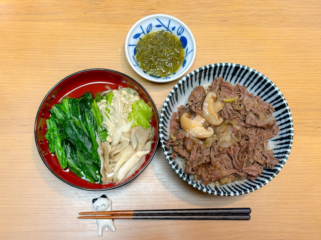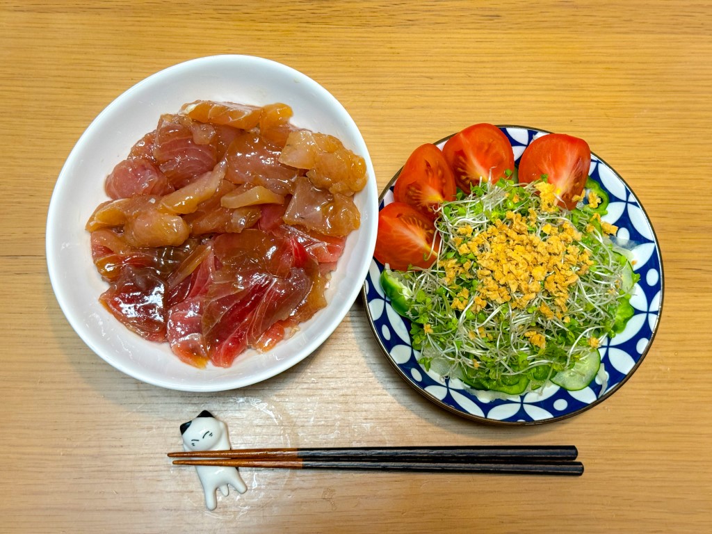 8:30 マグロ漬け丼、サラダ12:00 牛丼、葉物野菜ときのこのスープ、めかぶ18:00 カレイの煮つけ、葉物野菜とれんこんの味噌汁、かぼちゃ煮物、もずく、玄米ごはん22:00 ヨーグルト、いちごジャム