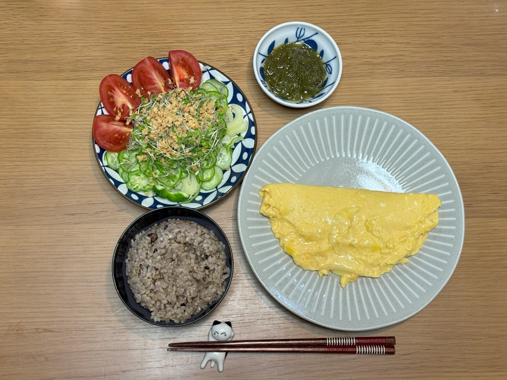 8:20 オムレツ、サラダ、めかぶ、玄米ごはん12:30 鶏むね西京焼き、葉物野菜ときのこのスープ、玄米ごはん18:00 メカジキ西京焼き、葉物野菜と大根の味噌汁、もずく、玄米ごはん