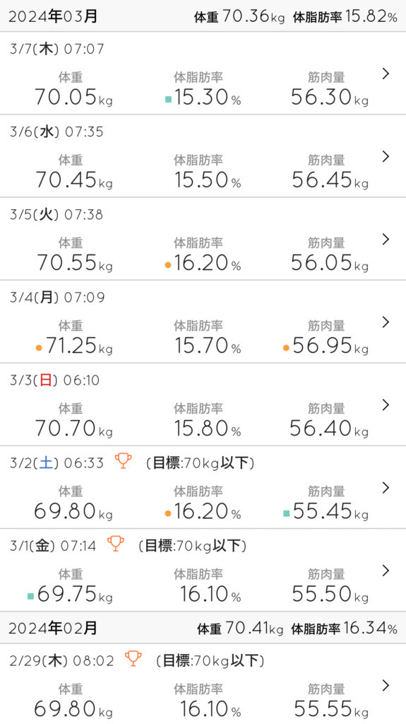 70kg台をキープ。同じ70kg台でも、以前よりも体脂肪率が若干下がってきた気がする…気のせい?