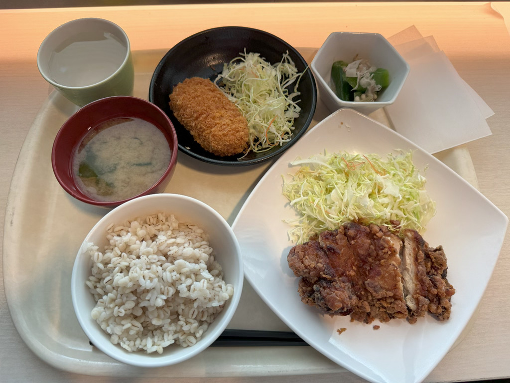 12:00 豚ロース西京焼き、餃子タネのハンバーグ、葉物野菜とキノコのスープ、玄米ごはん17:30 白身魚のアンチョビソース焼き、きのこと葉物野菜の味噌汁、もずく、玄米ごはん