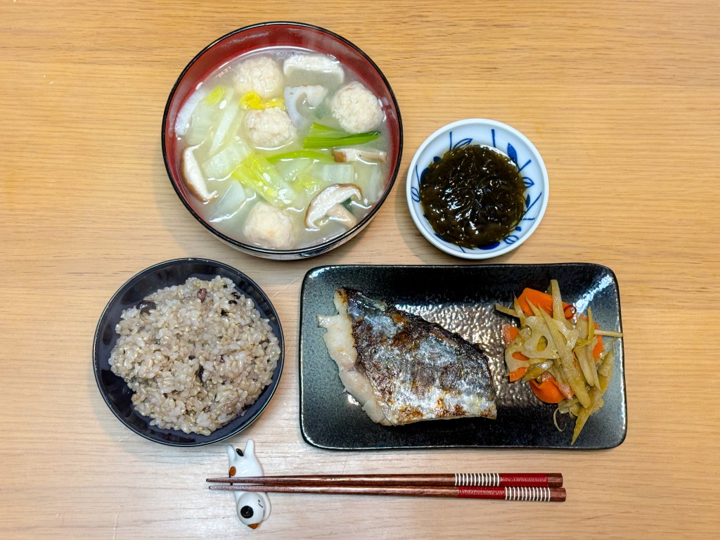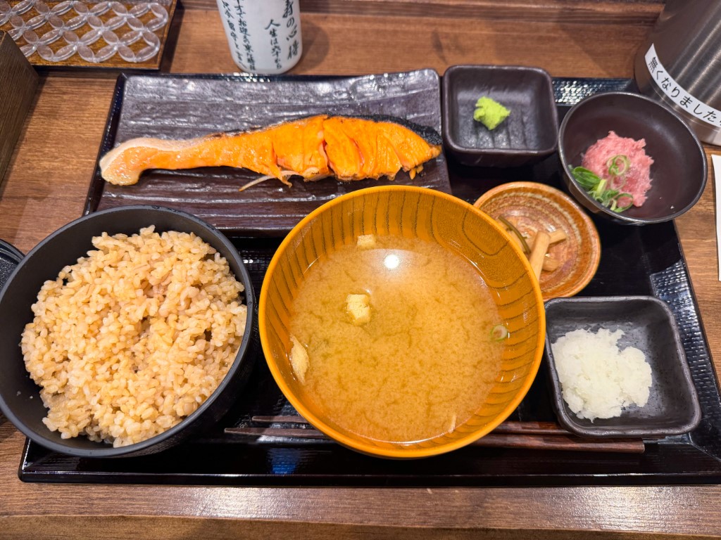 17:30 爆弾おにぎり(すじこ・鮭)、味噌汁、日本酒(2合)